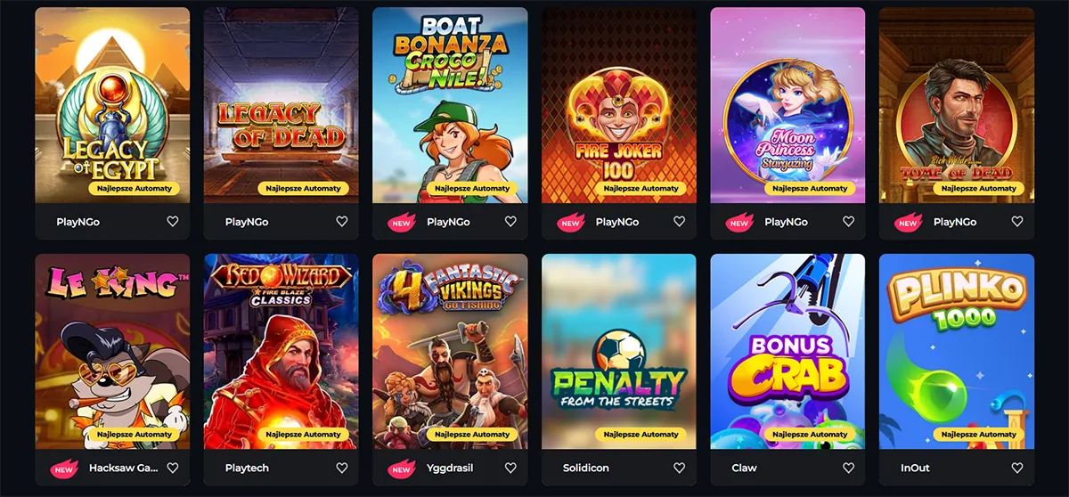 Nasza kolekcja automatów do gier zawiera tytuły od czołowych dostawców jak NetEnt, Pragmatic Play i Yggdrasil Gaming. Możesz zagrać w popularne video sloty takie jak Starburst, Book of Dead czy Gonzo's Quest.