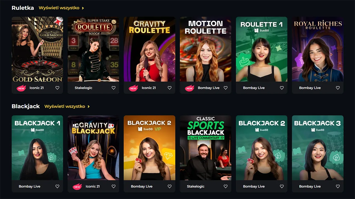 Nasze live casino łączy atmosferę prawdziwego kasyna z wygodą gry online. Profesjonalni krupierzy prowadzą gry na żywo 24 godziny na dobę.